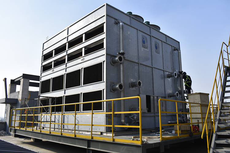 高溫工作流體進(jìn)入表冷器,廢熱通過(guò)盤(pán)管外壁與下落的噴淋水接觸進(jìn)行熱質(zhì)交換并與側(cè)面進(jìn)風(fēng)的干冷空氣垂直交替形成飽和的濕熱空氣。熱量由頂部風(fēng)機(jī)排出,水分則由特殊結(jié)構(gòu)的脫水器擋回集水槽循環(huán)使用。不同于逆流式,橫流式的噴淋水首先經(jīng)過(guò)PVC填料預(yù)冷,其換熱效果更加明顯。